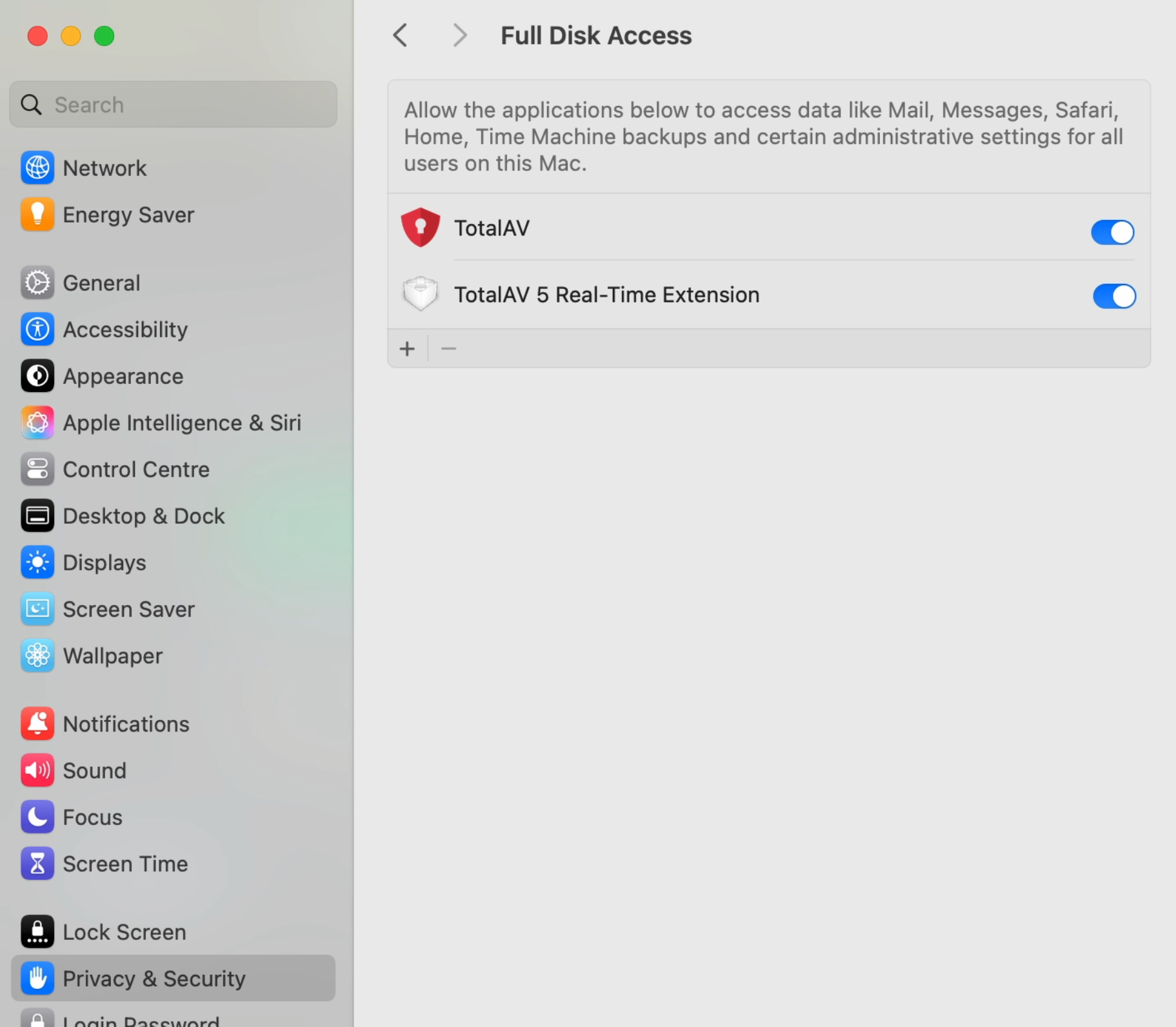 • Włączono TotalAV, aby mieć pełny dostęp do dysku, klikając przycisk przełączający.
