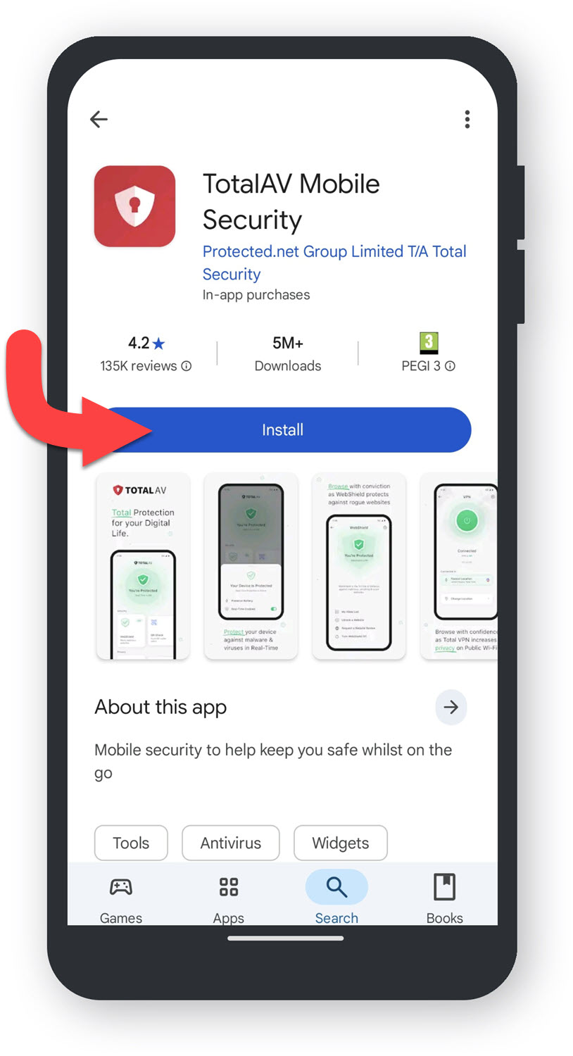 Kliknij Zainstaluj na stronie TotalAV Google Play Store.