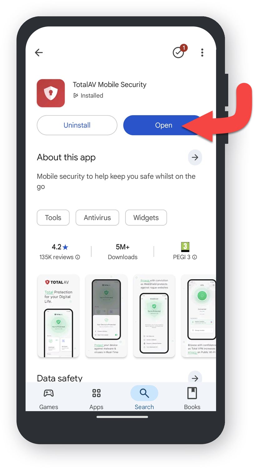 Kliknij Otwórz, aby otworzyć aplikację TotalAV.