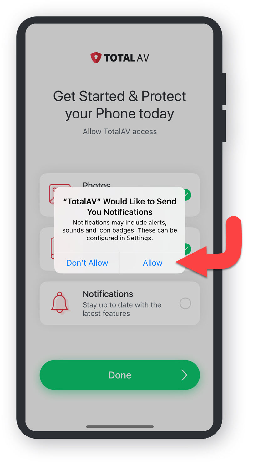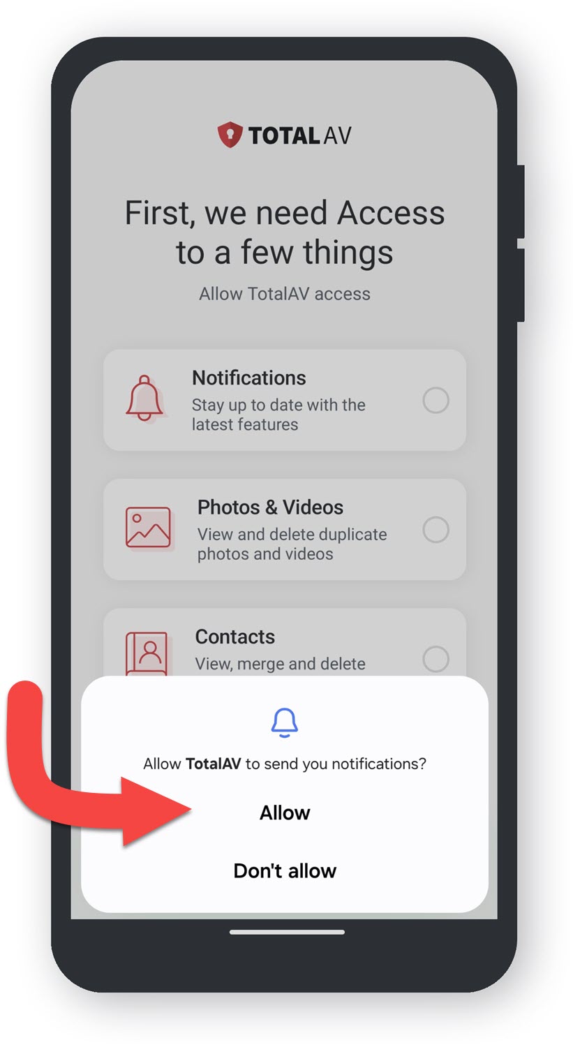 • Aby rozpocząć zezwalanie aplikacji TotalAV na dostęp do urządzenia, kliknij Zezwól, aby umożliwić aplikacji TotalAV wysyłanie powiadomień.
