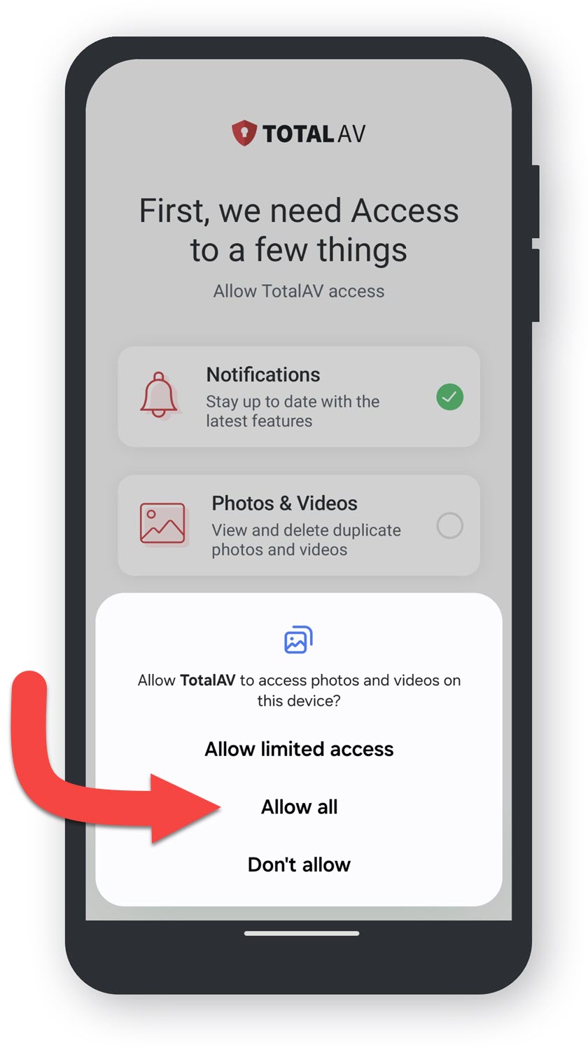 • Kliknij Zezwól na wszystkie, aby zezwolić TotalAV na dostęp do Twoich zdjęć i filmów. Jeśli nie chcesz udzielać TotalAV pełnego dostępu, kliknij Zezwól na ograniczony dostęp.