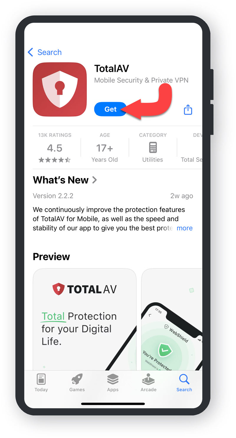 Kliknij Pobierz na stronie TotalAV App Store. Może być konieczne podanie danych logowania Apple, aby autoryzować bezpłatny zakup aplikacji.