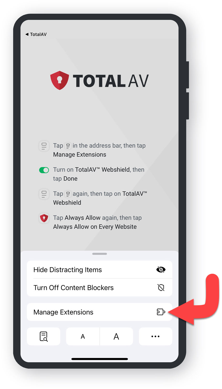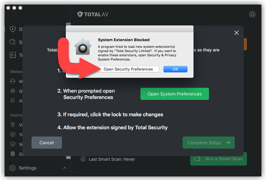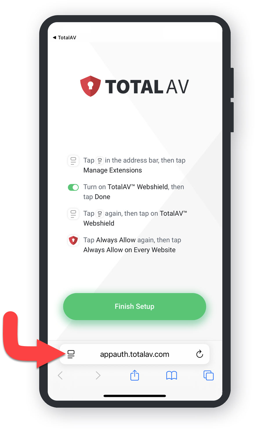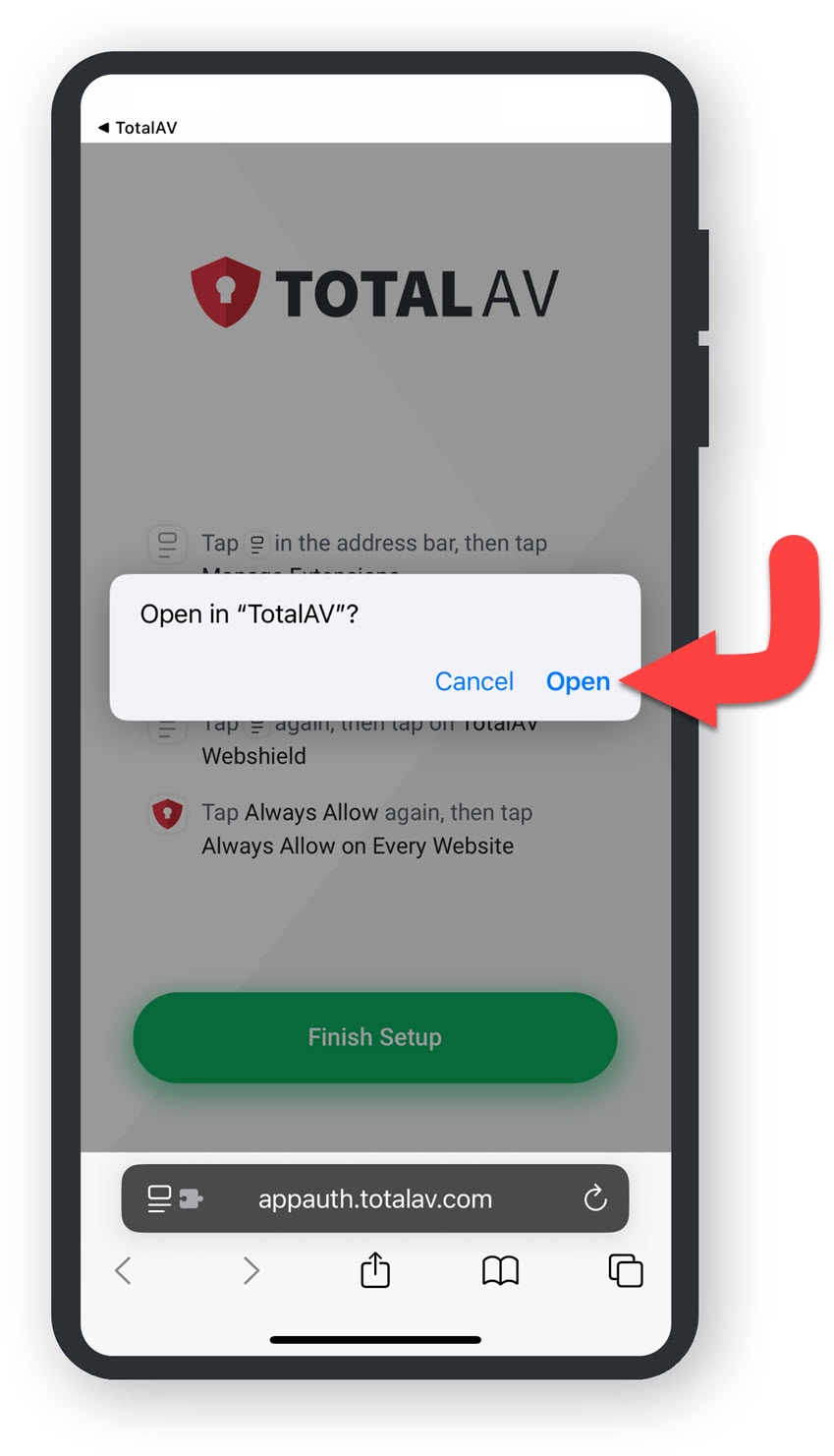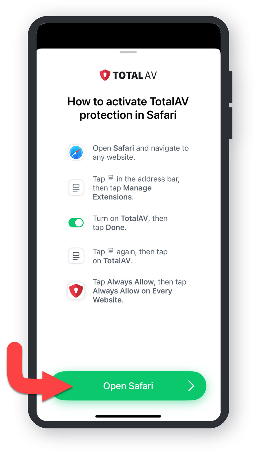 • Otworzy się nowe okno z instrukcją aktywacji TotalAV Webshield. Aby rozpocząć, naciśnij Otwórz Safari.