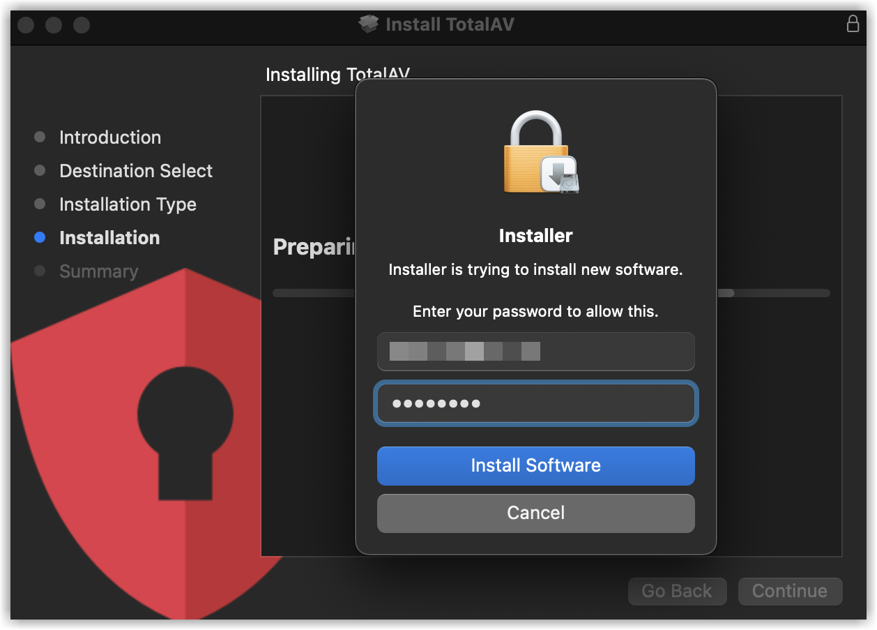 Wprowadź hasło Apple Mac i kliknij Zainstaluj oprogramowanie.