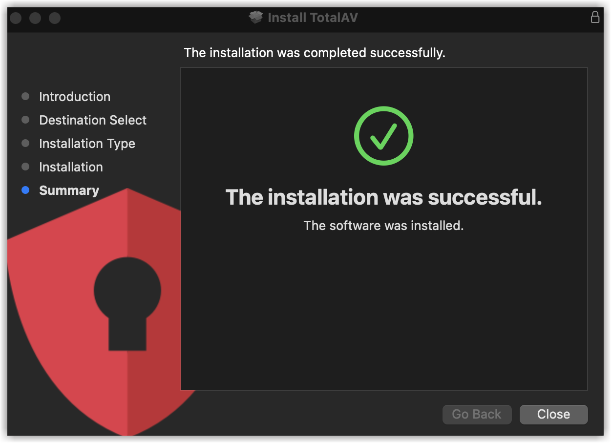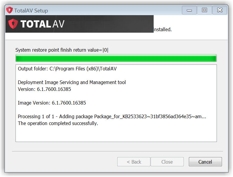 Kliknij Zamknij, aby przejść do aplikacji TotalAV.