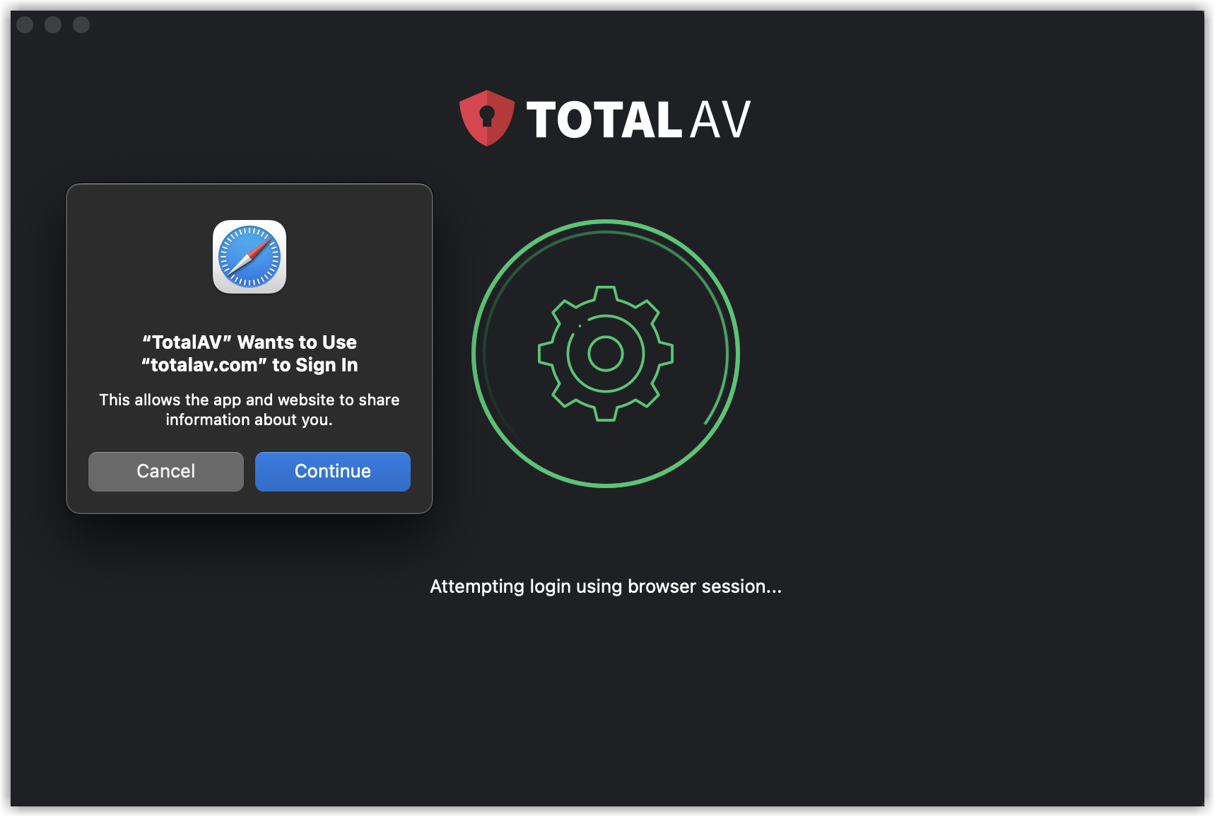 TotalAV spróbuje zalogować się, używając bieżącej sesji przeglądarki. Kliknij Kontynuuj. Jeśli się nie uda, wykonaj następny krok.
