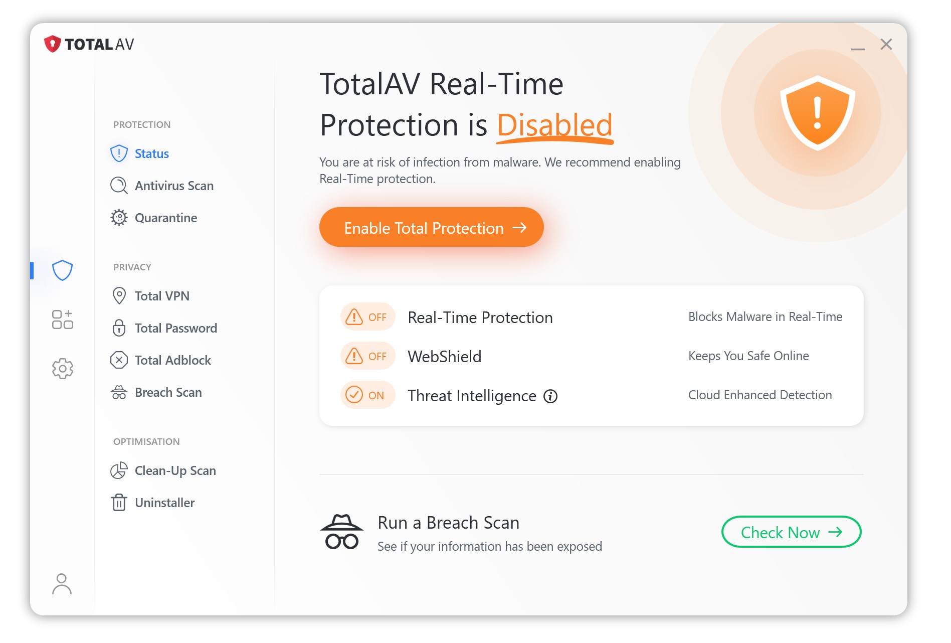 Po zainstalowaniu TotalAV należy włączyć Ochronę w czasie rzeczywistym, aby zabezpieczyć się przed zagrożeniami w czasie rzeczywistym.