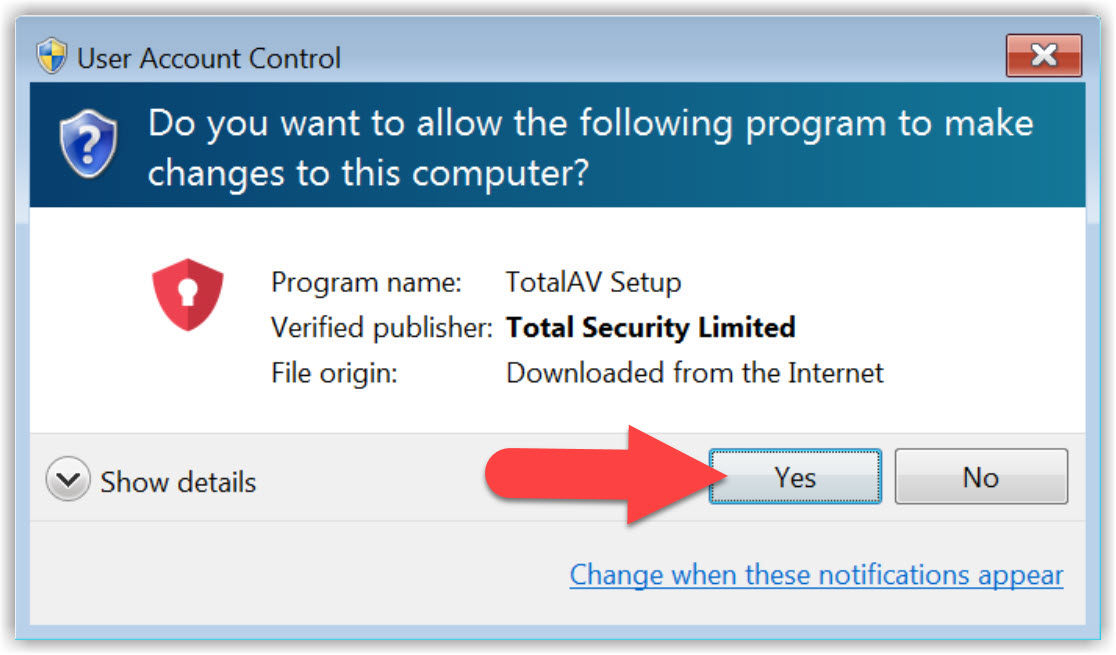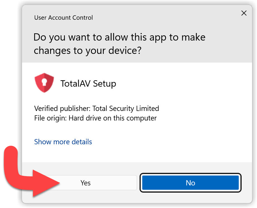 Następnie kliknij Tak, aby zezwolić TotalAV na rozpoczęcie procesu instalacji. Bez zatwierdzenia aplikacja TotalAV nie będzie mogła zostać zainstalowana na Twoim urządzeniu.